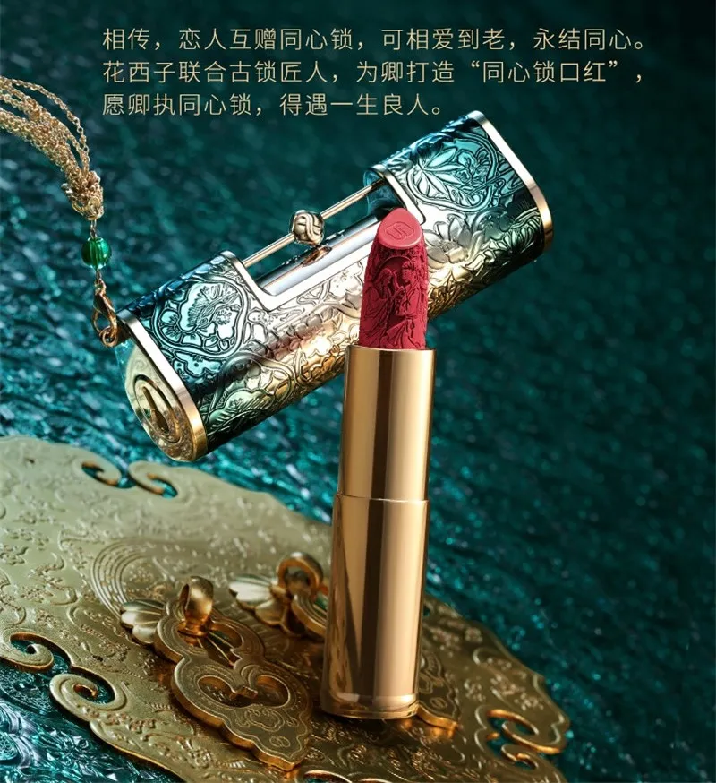 除了搭配的眉笔以外,花西子还主导设计开发了私模产品,以古代同心锁为灵感,设计出了同心锁口红,寓意为永结同心。还借用“张敞画眉”这个中国古代四大浪漫情事之一,将“张敞画眉”的场景通过微雕工艺和浮雕工艺还原,将细致且立体的场面雕在同心锁口红上。